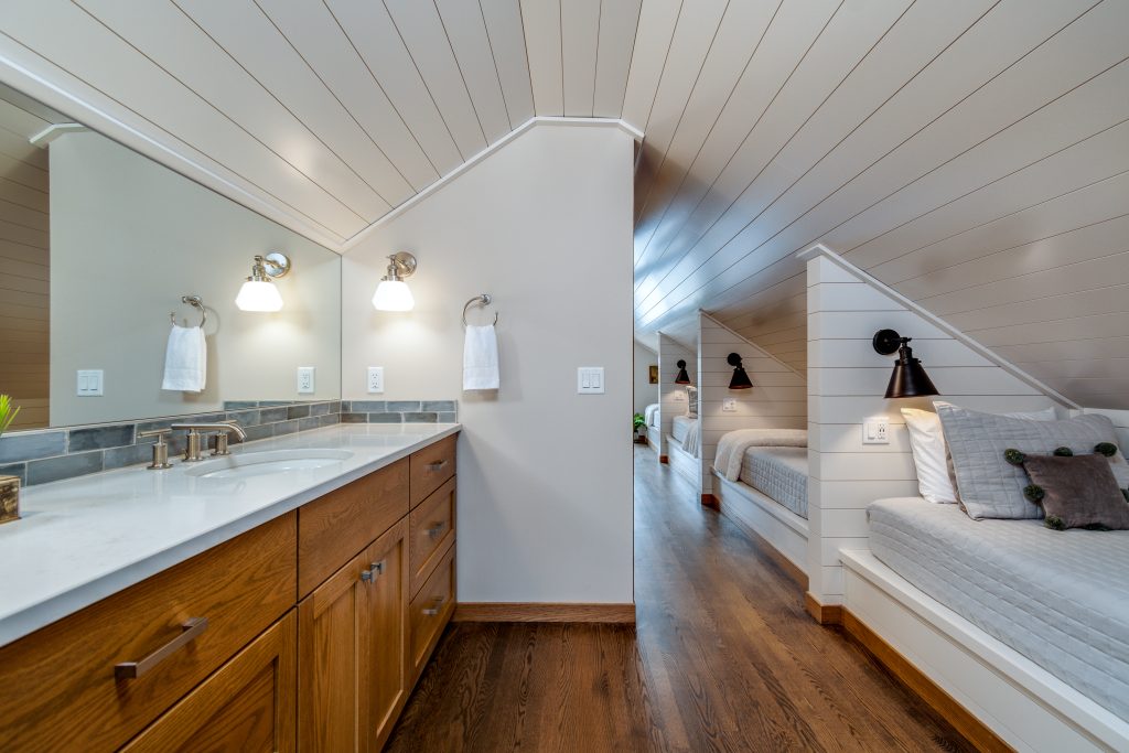 In the attic loft, space planning was key. This area, redesigned for the client’s children, emphasized function without sacrificing charm. The layout includes sleeping quarters, a playful but polished bath, and a tucked-away office — all tied together with clean lines and materials that honor traditions while welcoming youthful energy.