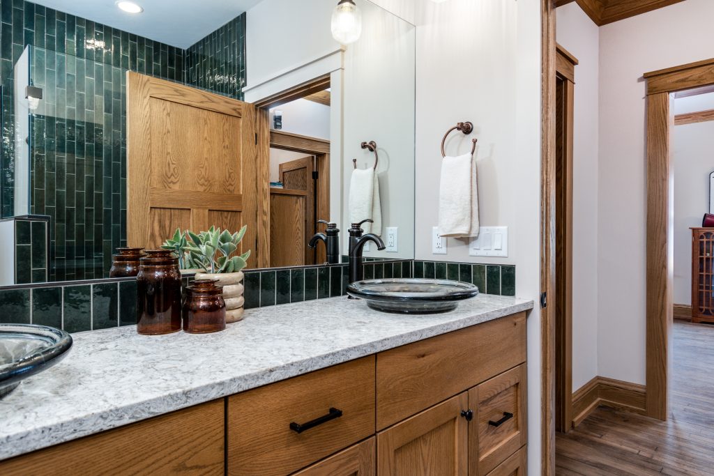 The bathrooms are where we had the most fun expressing personality through materials! A stained-glass-inspired tile feature in the owner’s suite pays homage to the client’s love of artisan details — a hallmark of Craftsman style. In the main bath, a twist on classic green subway tile, installed vertically, offers a subtle modern take. Even the basement bathroom didn’t escape the narrative: a Badger Red tile accent wall and textured bronze fixture cleverly reference both university pride and meticulous artisanship.