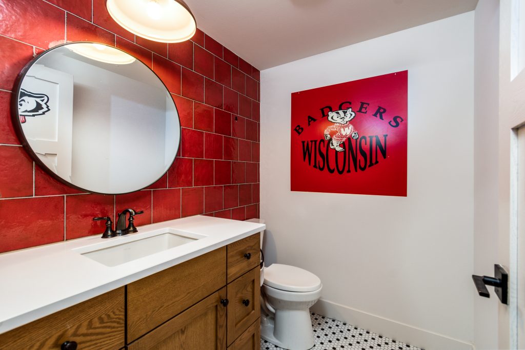 Even the basement bathroom didn’t escape the narrative: a Badger Red tile accent wall and textured bronze fixture cleverly reference both university pride and meticulous artisanship.