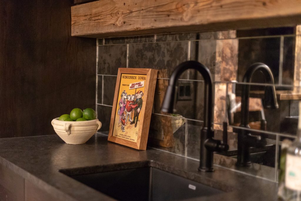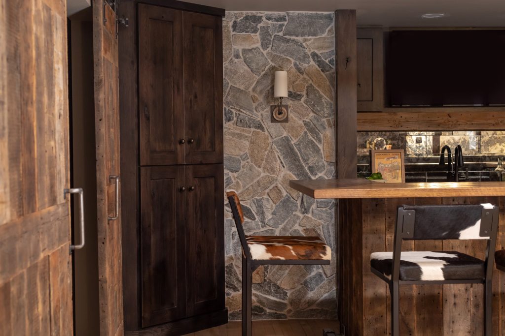 The request was to turn the sparse, disjointed basement room into a western-themed bar and living room with lots of wood and natural, rustic elements. Strategic room arrangement, locally-sourced reclaimed wood panels, reclaimed wood beams, natural stone columns, leathered granite and wood countertops, dark-stained hickory cabinetry, antique-mirrored glass tiles, hand-crafted barn doors, wide-plank wood floors, locally-crafted footrail and table base, custom-made booth, textural furniture, and 2 TV’s (of course!) were roped together to create his western-themed, yet tastefully refined, cozy space for entertaining and hanging out.
