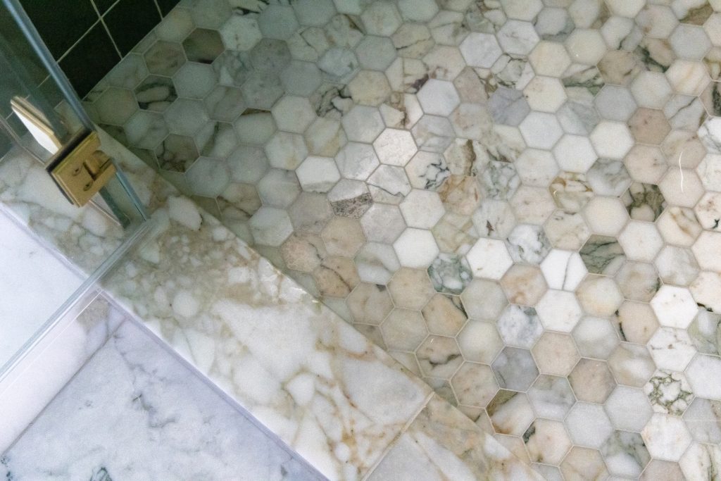 This dramatic primary bathroom balances elegance with bold expression. Rooted in rich materials and layered textures, the design showcases a palette of deep green tile, creamy marble, luxe brass finishes, and organic movement throughout. The space centers around a walk-in shower wrapped in beautiful emerald ceramic tile, stacked and chevroned to create a dynamic contrast between upper and lower walls. Calacatta Verde marble brings softness and variation across the shower bench, niche, and curb, while two options of mosaic hex tile add texture underfoot.