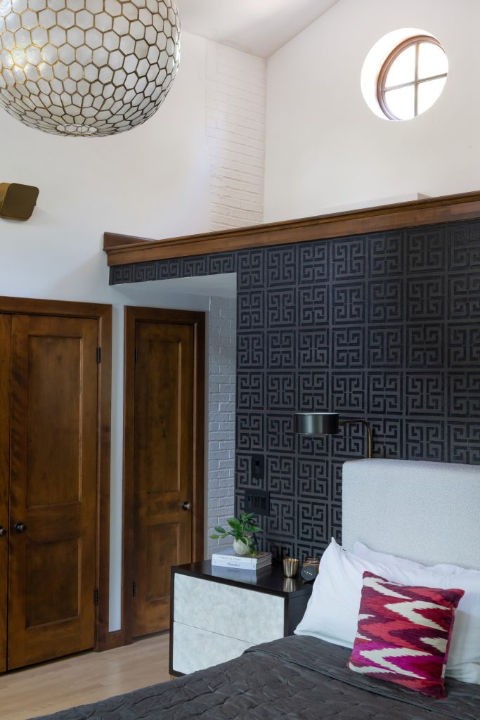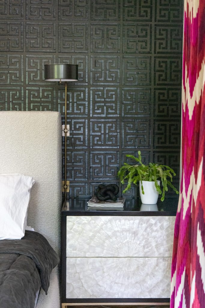 At the heart of the room is an upholstered bedframe with crisp black-and-white bedding and tonal layers of blush, slate, and plum. The soft blush rug underfoot grounds the space with warmth, while custom drapery in a bold velvet ikat and wallpaper with a hand-printed greek pattern add dramatic texture and contrast.