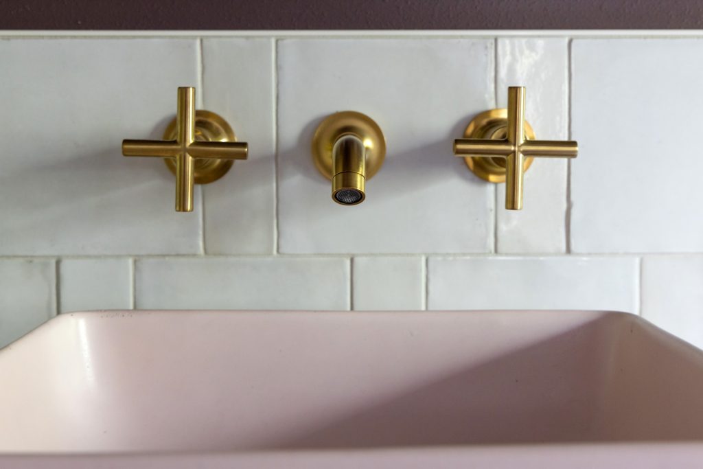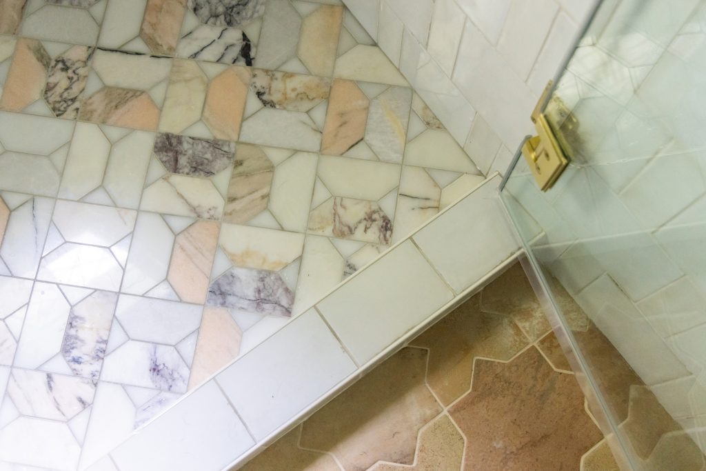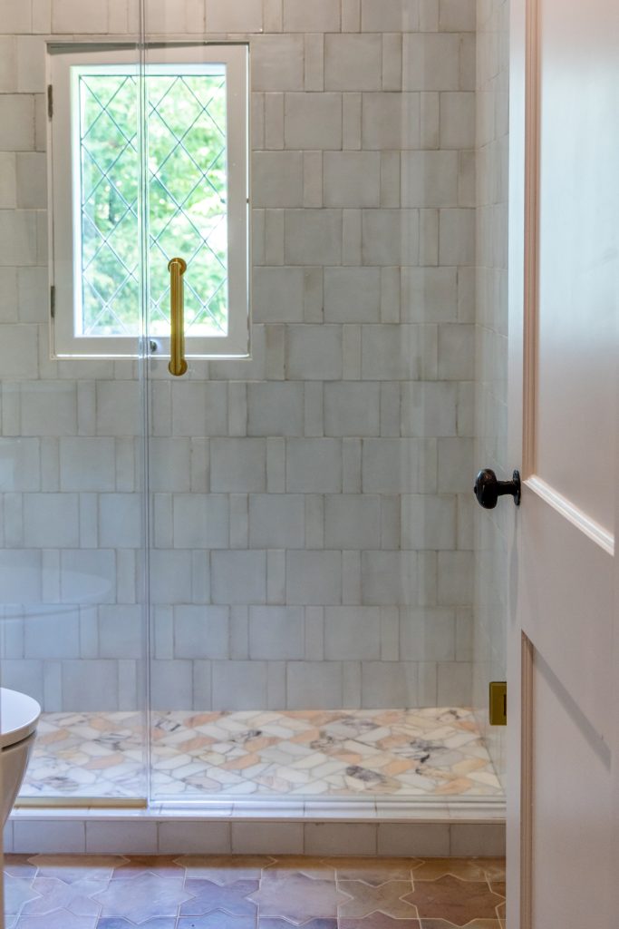 The star of the space is the custom tile work with an interplay of soft terracotta floor tile, hand-glazed Bianco wall tile in two sizes, and a marbled organic shower floor mosaic. Continuing in the shower, a clean-lined glass enclosure and linear drain keep things feeling polished and open, while a combination of handheld and wall-mounted shower fixtures in vibrant brushed brass offer function without compromising on form.