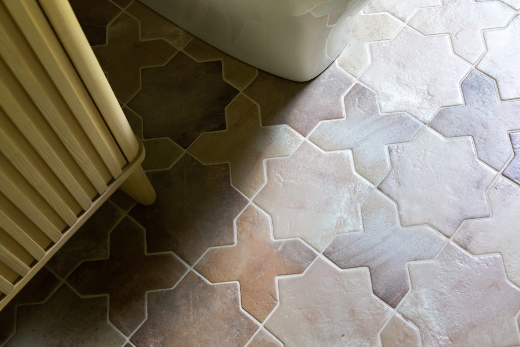 In the guest bathroom, expressive pattern meets high-end craftsmanship. Inspired by a modern Moroccan aesthetic, the palette blends deep, saturated hues with geometric tile, brushed brass finishes, and sculptural lighting.