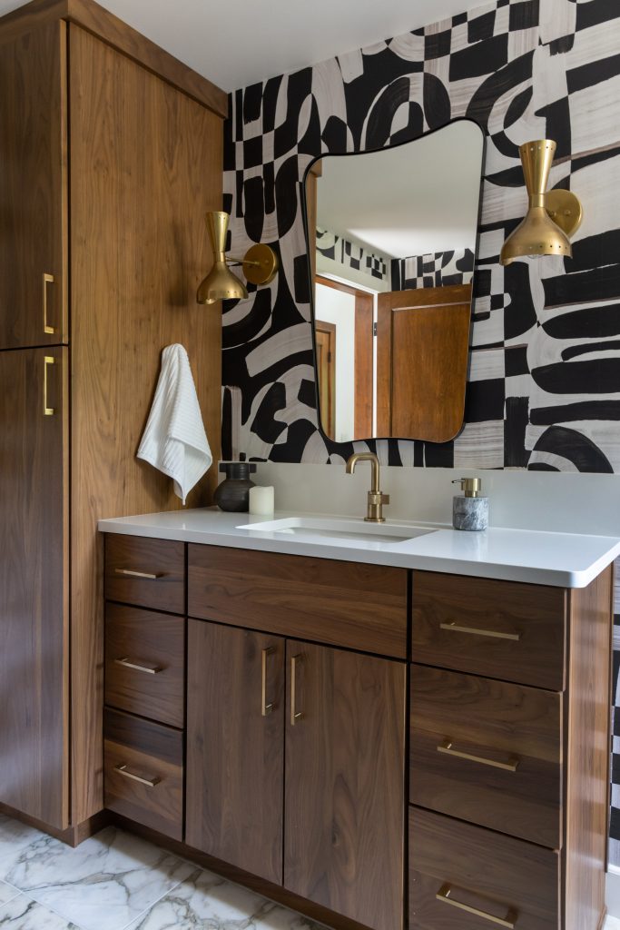 The walnut vanity with satin bronze hardware was designed to feel like a furniture piece, grounded with a Ridgeline edge quartz top and a tailored 6″ backsplash. Above the sink, a pair of vintage-inspired Italian sconces in raw brass provide a sculptural moment, complemented by a wallpapered accent wall with transposed whimsical brushstrokes.