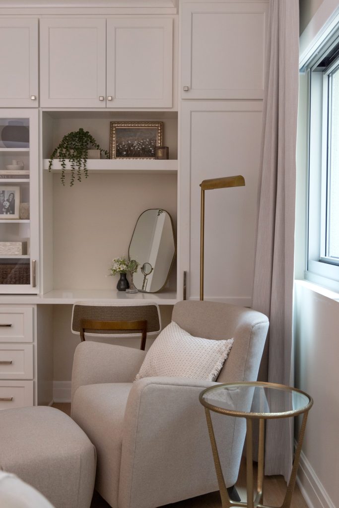 Across the room, a French-inspired secretary desk paired with an upholstered desk chair provides an organized workspace, while a rounded swivel chair in charcoal performance fabric forms a plush corner for reading or relaxing.