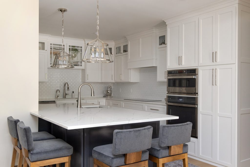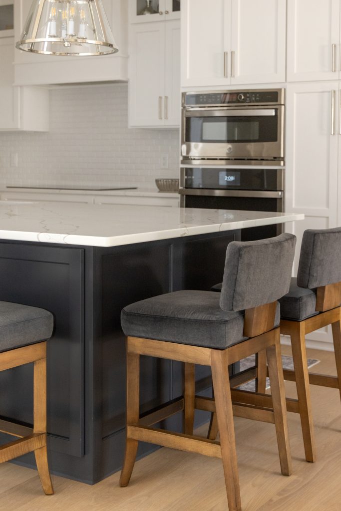 In the kitchen, custom swivel counter stools combine comfort and durability, upholstered in performance fabric to enjoy food and drink with abandon. Their light wood finish complements the Sherwin Williams Natural Linen cabinetry, creating a tonal, airy palette. Glass-front upper cabinets showcase curated décor, adding visual interest and a layered sense of style to the space. The mix of functional design and thoughtful detailing makes this kitchen both practical and beautifully composed.