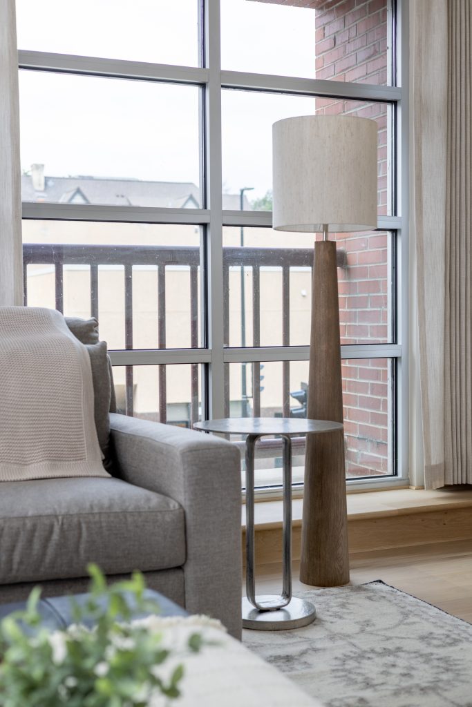 While custom drapery frames the windows, accent lighting plays a key role in shaping the atmosphere. Ceramic table lamps and a tapered wooden floor lamp cast a warm, diffused glow across the space. Accessories and accents such as custom pillows, throws, and decorative objects add layers of visual interest and complement the clean lines of the custom furniture.