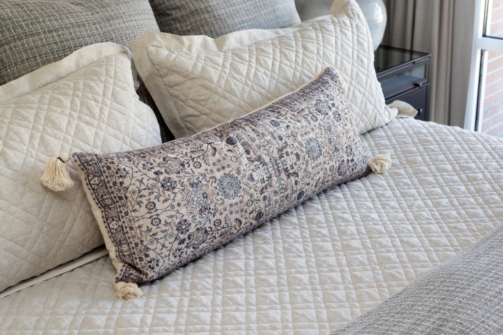 The center of the room has a tall upholstered bed in a soft cream linen-blend with wire-brushed legs. Our selection of bedding included a natural washed linen coverlet and matching shams with a pure cashmere and lambswool duvet. A custom bench at the foot of the bed provides additional seating, and shadow-box nightstands with glass-front drawers house personal keepsakes and offer storage.