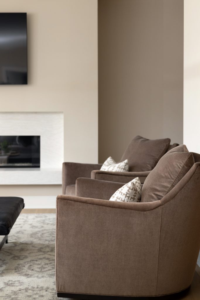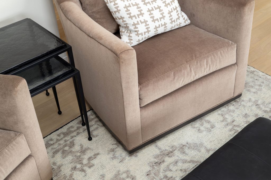 The living room is both comfortable and refined. A custom upholstered sectional has generous proportions that invite relaxation. Swivel chairs in a sumptuous velvety taupe allow for varied seating arrangements that encourage conversation. A hand-knotted rug anchors the room with traditional patterning and provides softness underfoot.