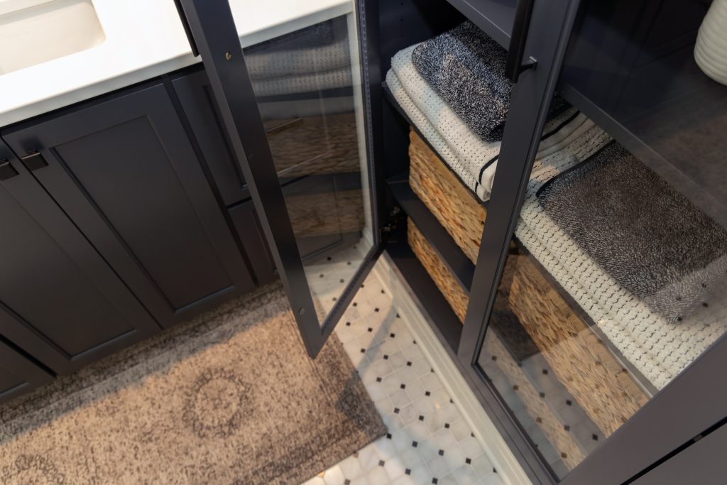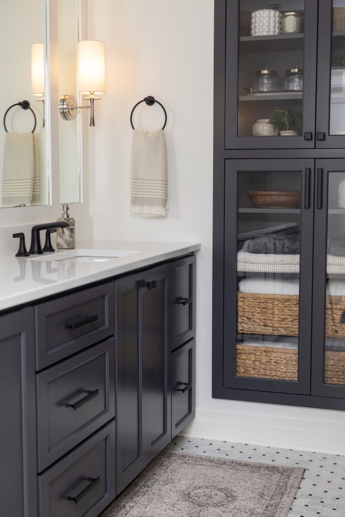 Custom mirrors with integrated sconces rise above the vanity, enhancing light and creating a sense of openness. Painted millwork provides clean lines and a cohesive design, and decor in the linen closet ensures this center focal point is a treat for the eyes.