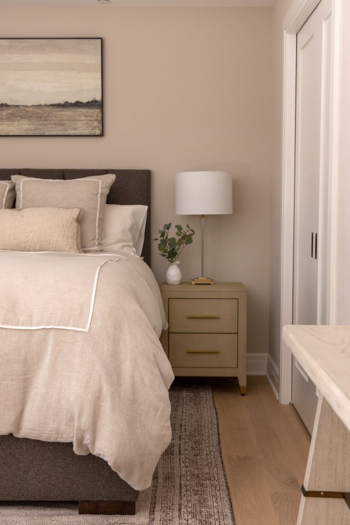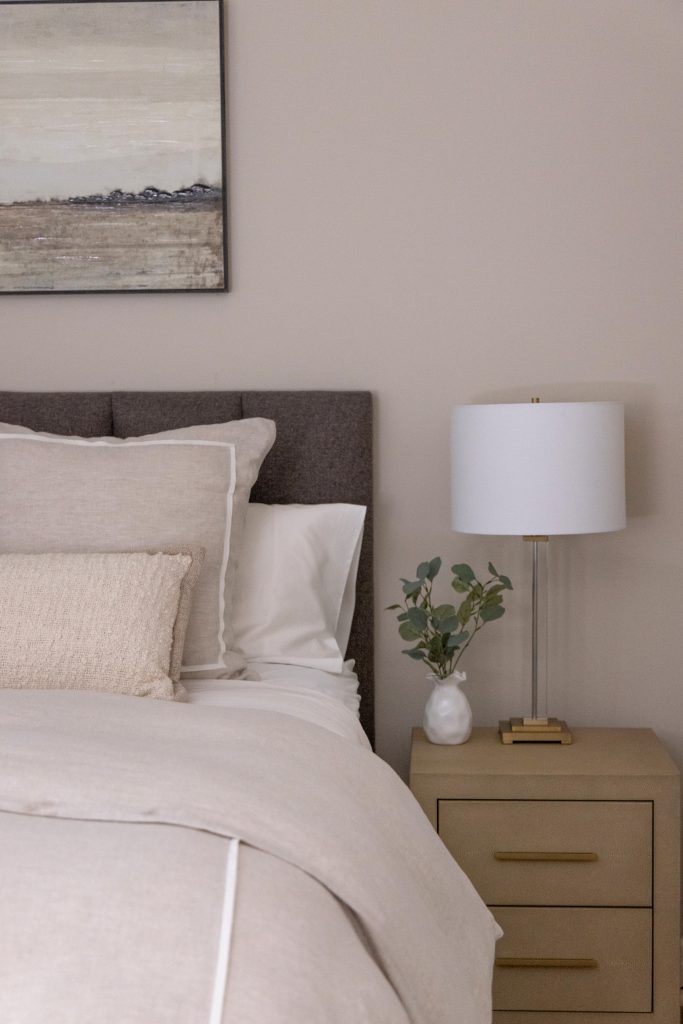 Lighting and reflective surfaces elevate the serene ambiance. Large ceramic table lamps with speckled white and gray glaze sit atop the nightstands, while a charming brass floor lamp adds an asymmetrical, modern touch. Custom wool drapery frames the windows, softening daylight and adding warmth.