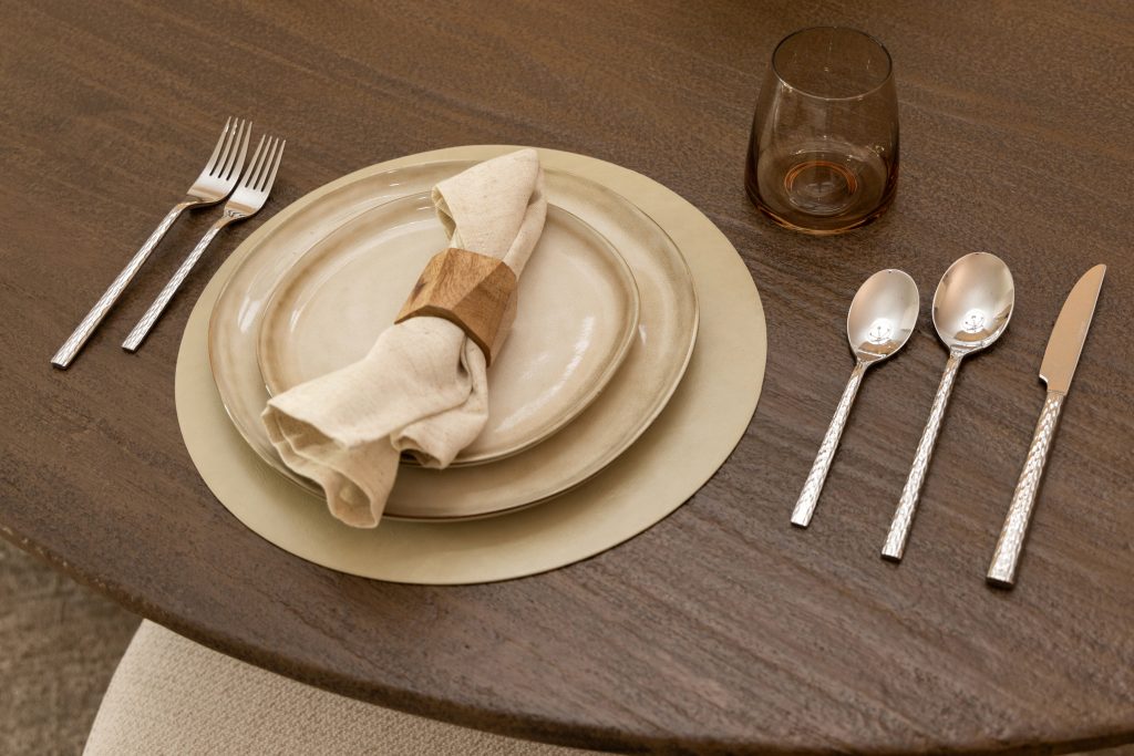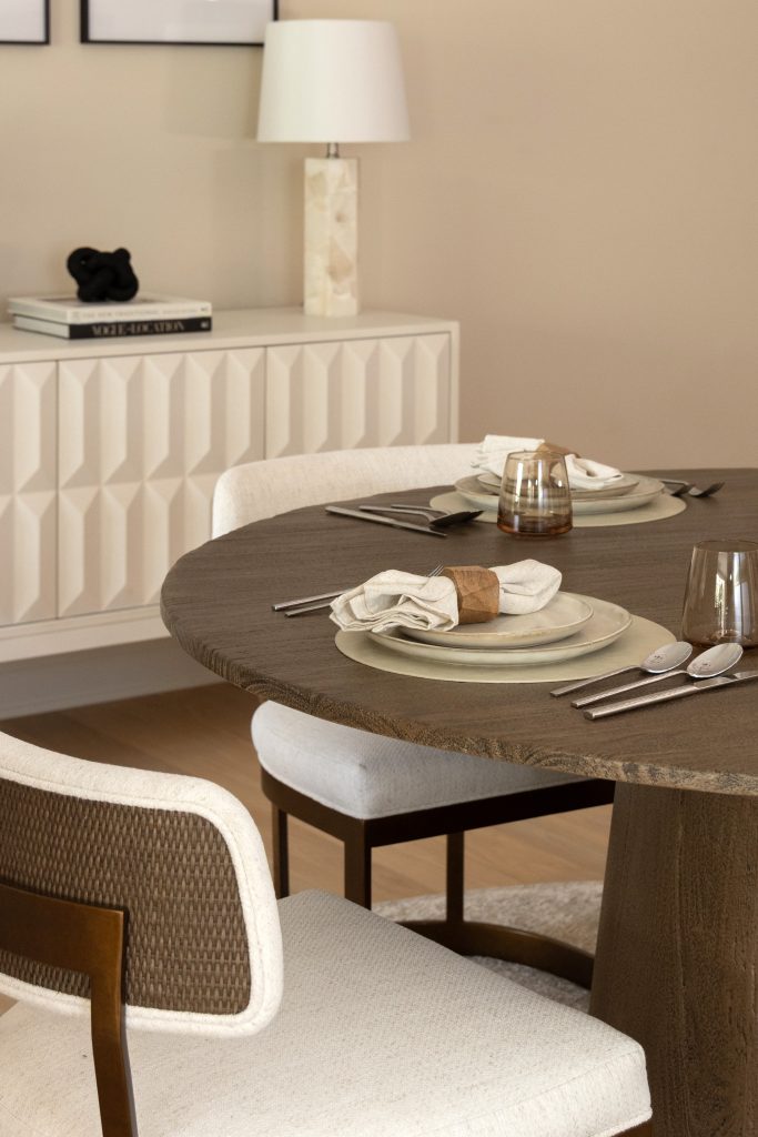 The statement dining table’s natural wood grain and generous proportions ground the space with dining chairs selected as a perfect complement. They feature a mix of tailored upholstery, a cane matting back, and an antique gold frame and legs that match the base of the table.