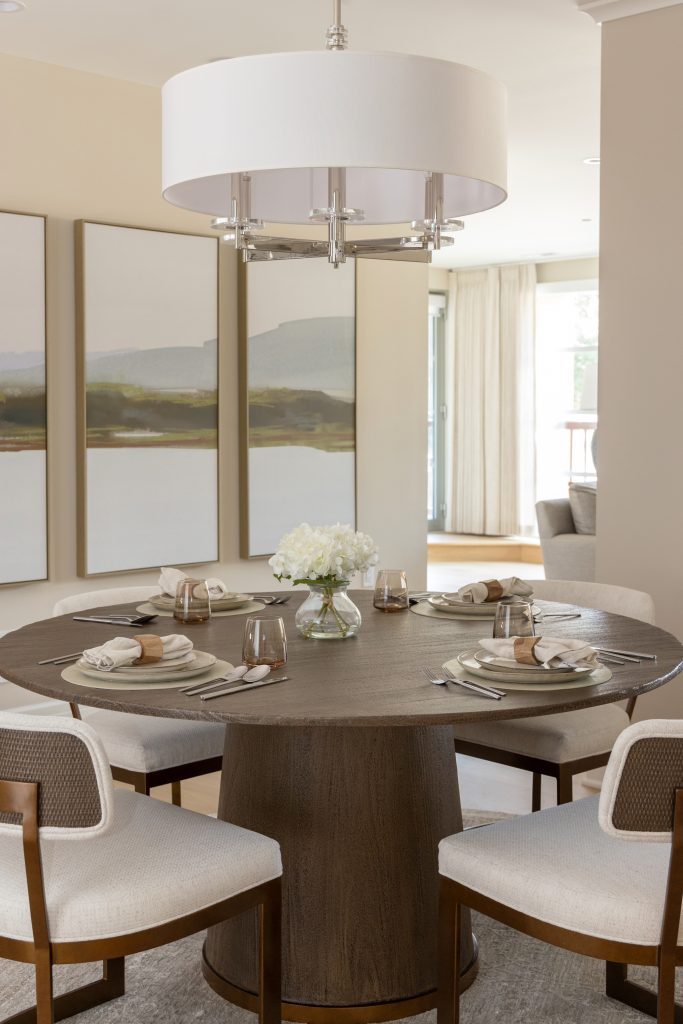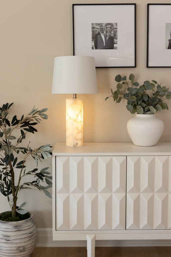 Art was also carefully selected for this area. With the right scale and a palette that echoes the tones of the furnishings, the pieces add depth and visual rhythm to the walls. Family pictures are featured above a sculptural media console, adding a deeply personal touch to the center of the unit.
