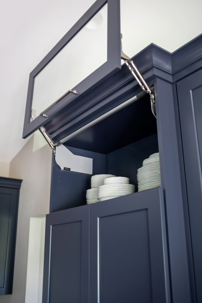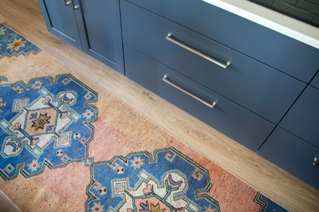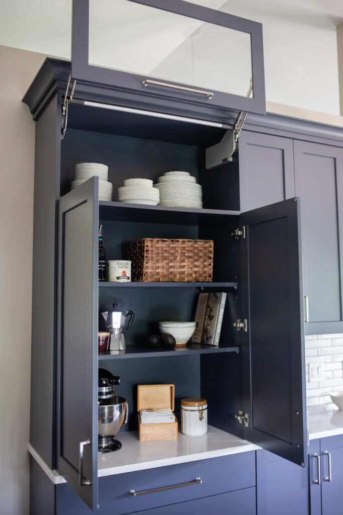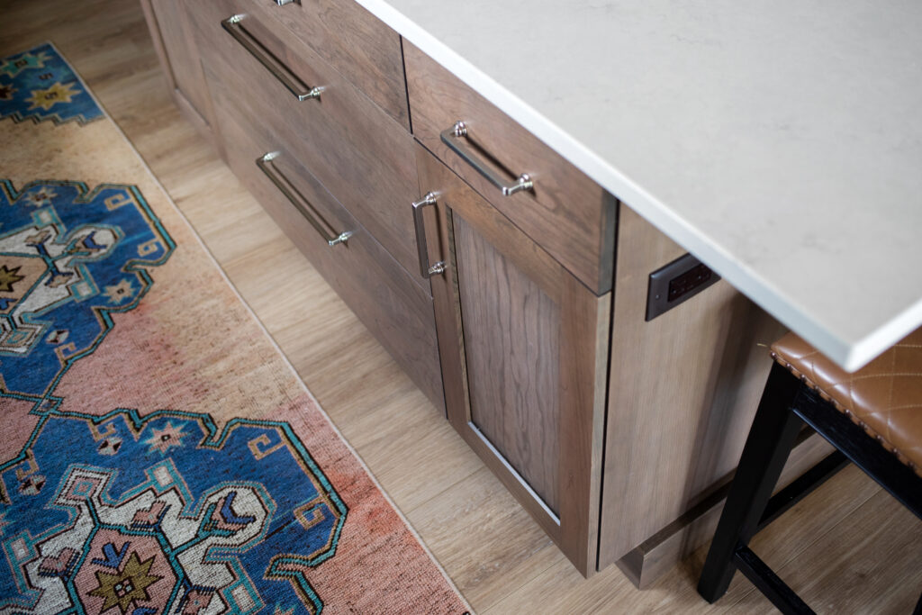 A simple move of the fridge reduced traffic jams and opened up the space for an additional countertop pantry. By keeping the wall between the kitchen and the living room as our clients preferred, we were able to add an additional countertop pantry for storage of large appliances. The position of the adjacent countertop is in the perfect location to whip up a cocktail for their guests when entertaining since it is immediately accessible from the dining, living, and kitchen.