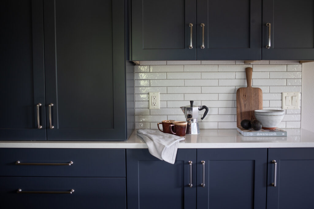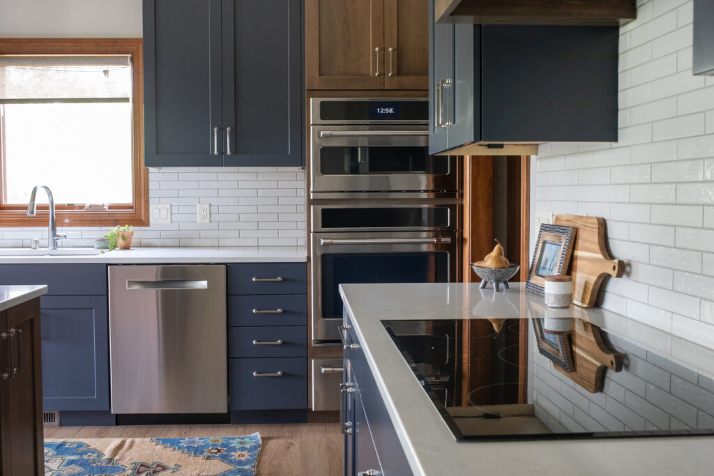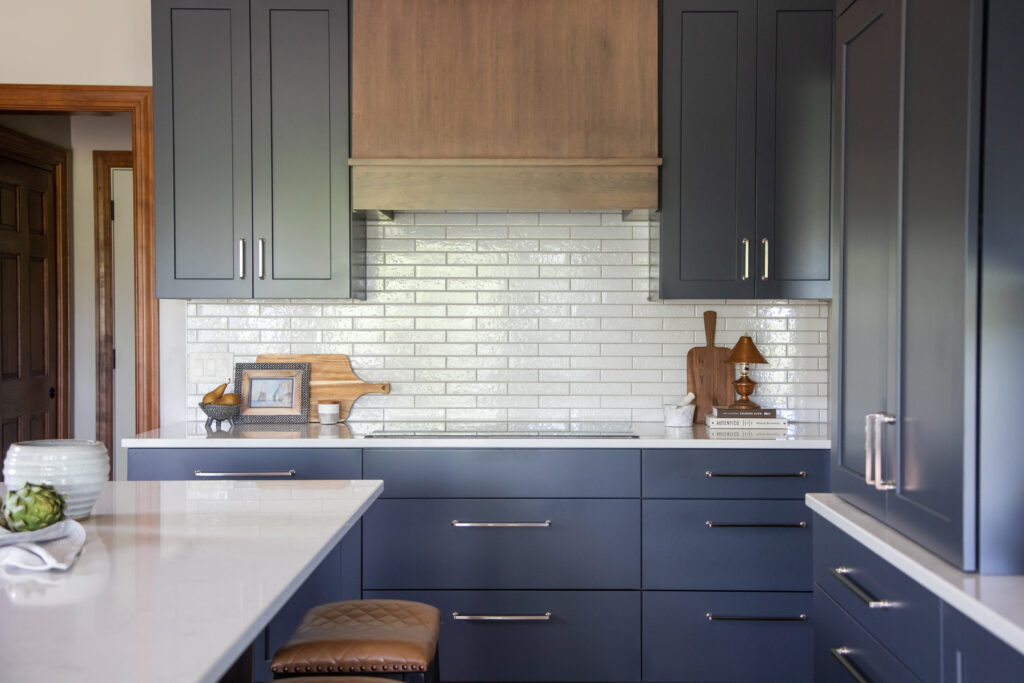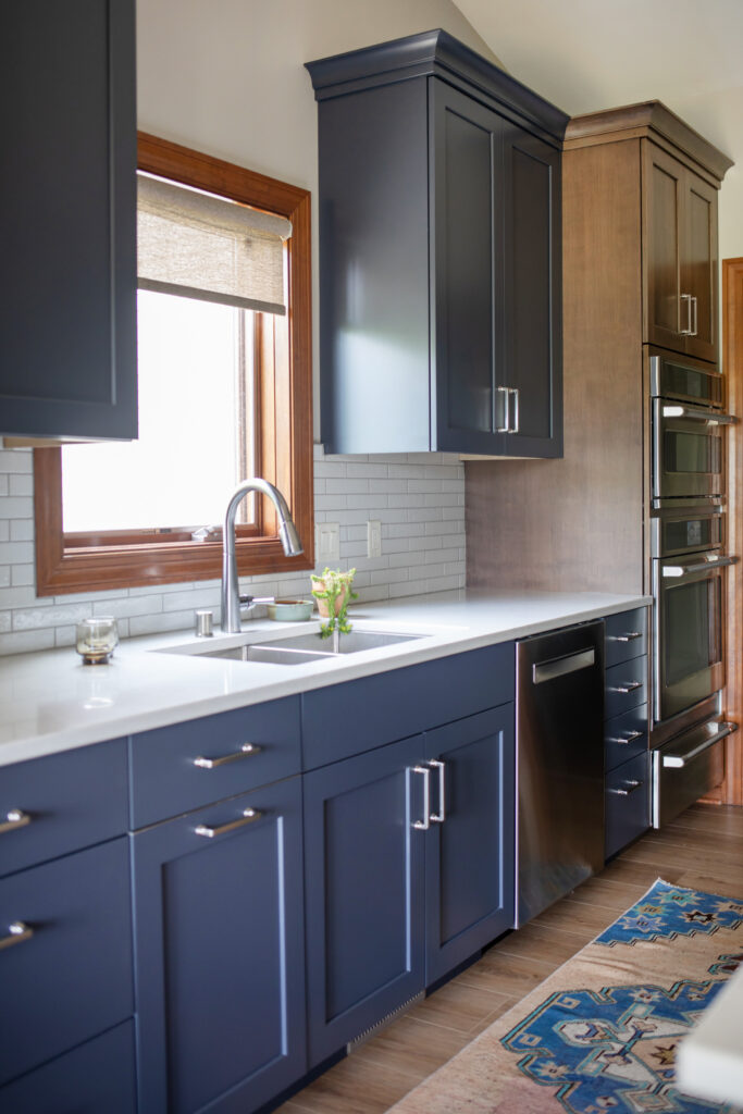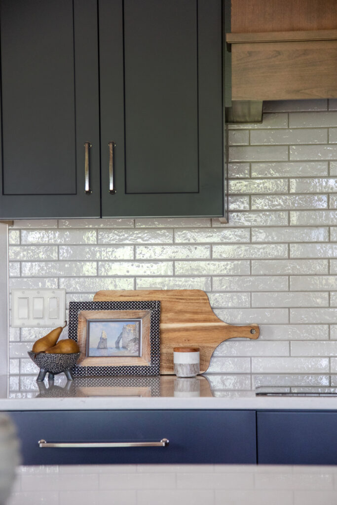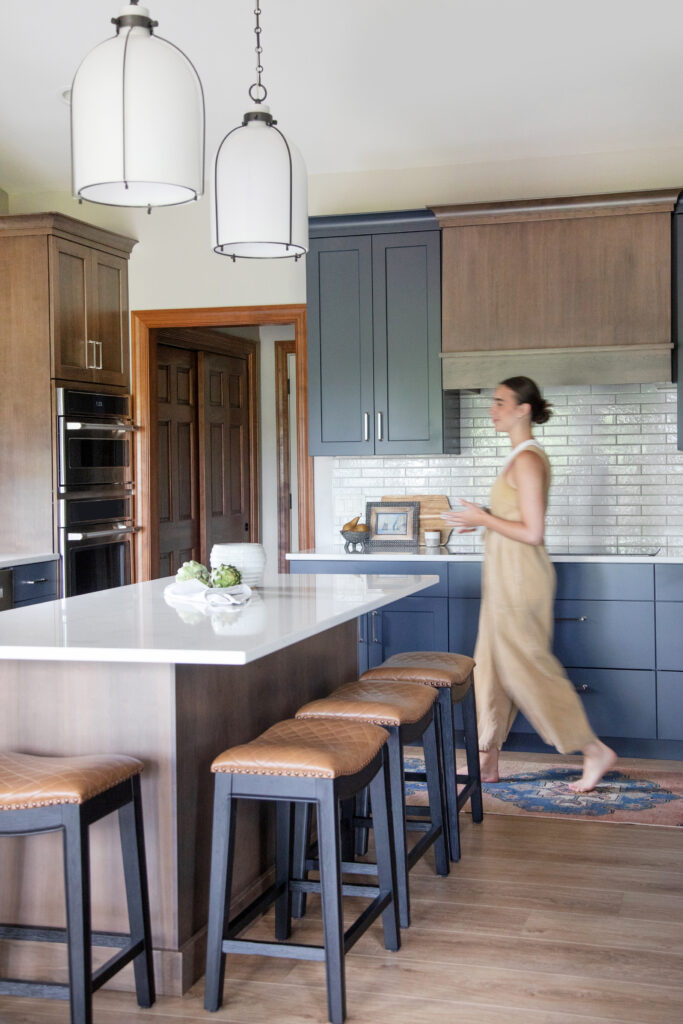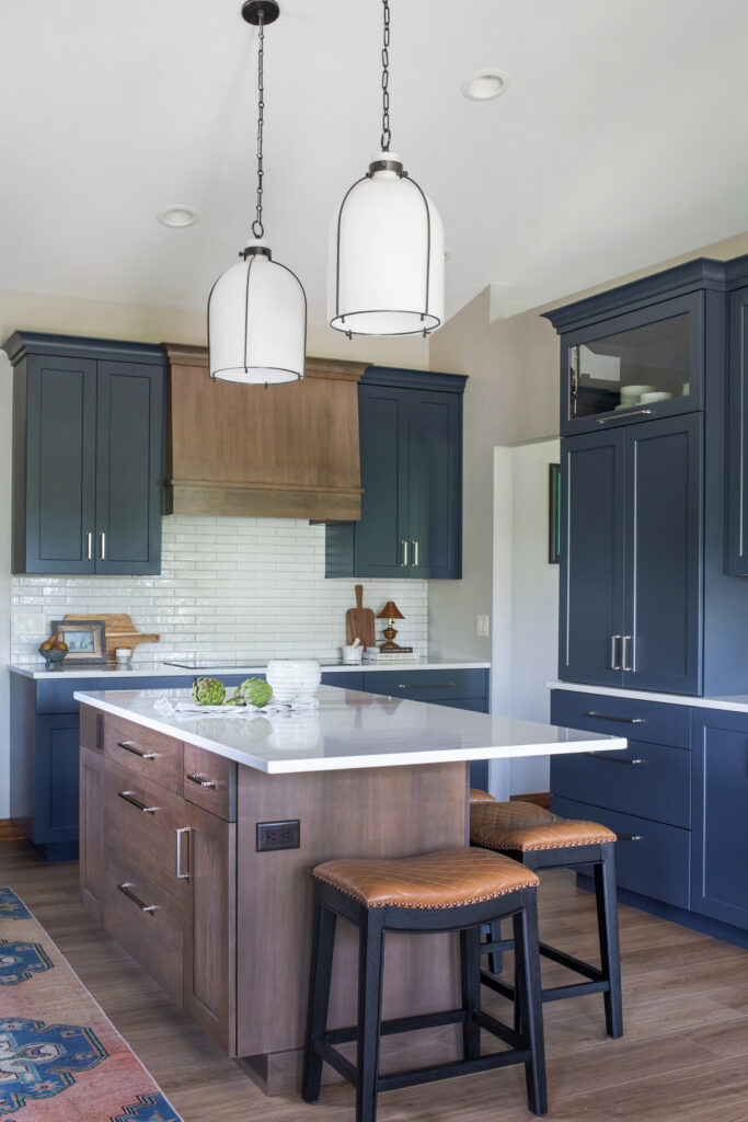 To elevate our clients style, we selected a beautiful mid-toned cherry wood and a deep, saturated blue. The mixture of materials and finishes created a dynamic and layered space, and the mix of stained and painted cabinetry allowed for us to seamlessly blend the new design with the existing trim in their home. The space is finished off with brushed nickel pulls, a soft veined quartz, a textural, glossy brick backsplash, and two large scale milk glass pendants.