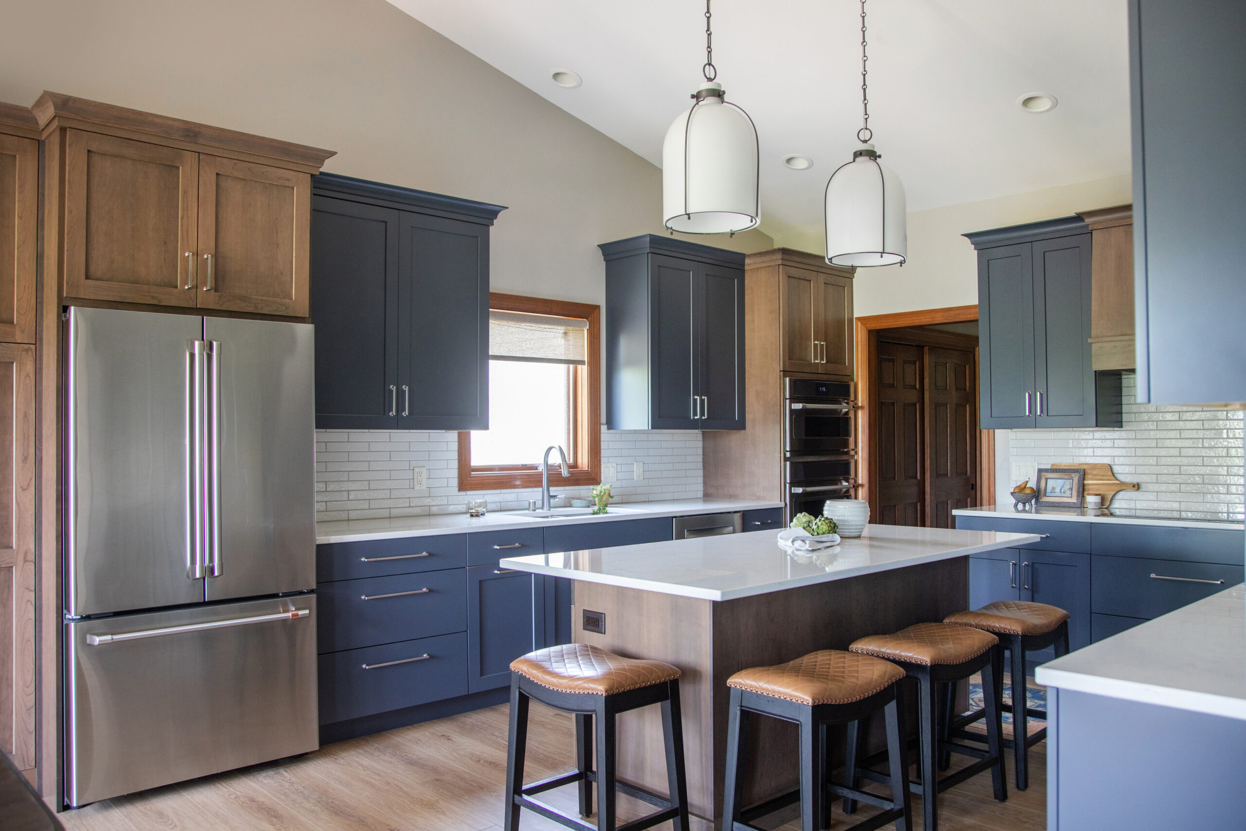 To elevate our clients style, we selected a beautiful mid-toned cherry wood and a deep, saturated blue. The mixture of materials and finishes created a dynamic and layered space, and the mix of stained and painted cabinetry allowed for us to seamlessly blend the new design with the existing trim in their home. The space is finished off with brushed nickel pulls, a soft veined quartz, a textural, glossy brick backsplash, and two large scale milk glass pendants.