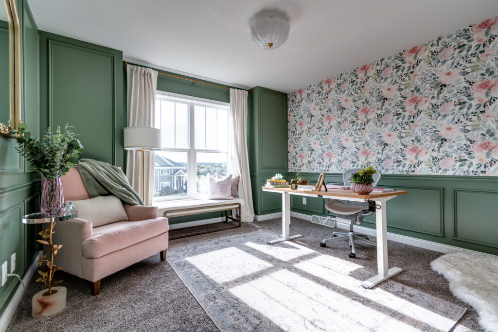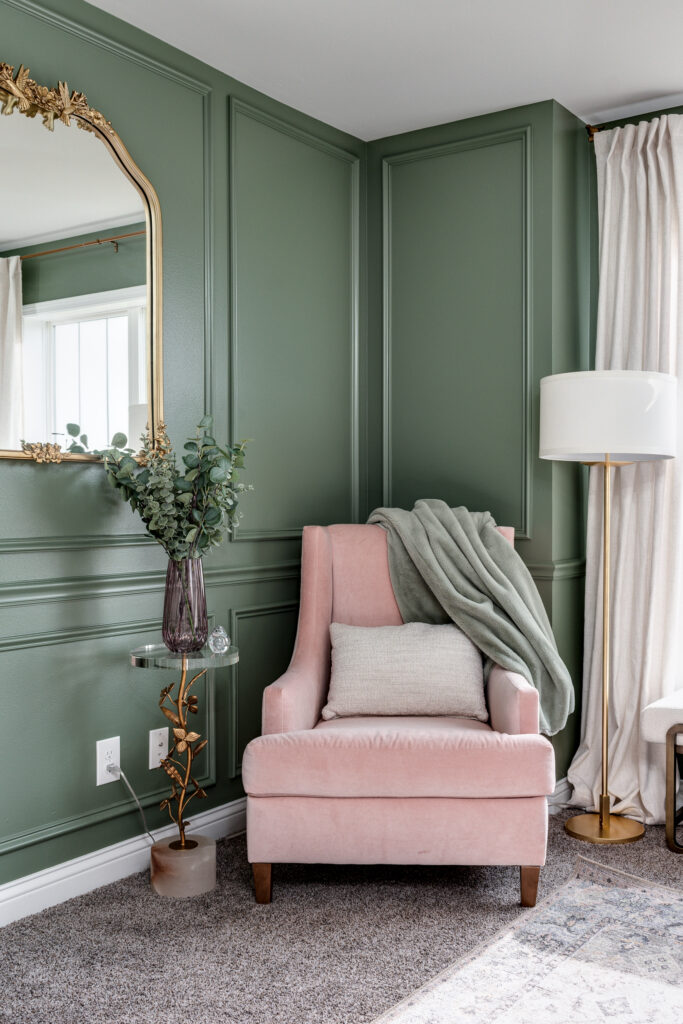 The millwork was a key piece in transforming this room. The chair rail, wainscoting, and paneling brought life to the flat walls, and the rich, deep green paint selection elevates the finished product.
