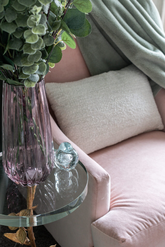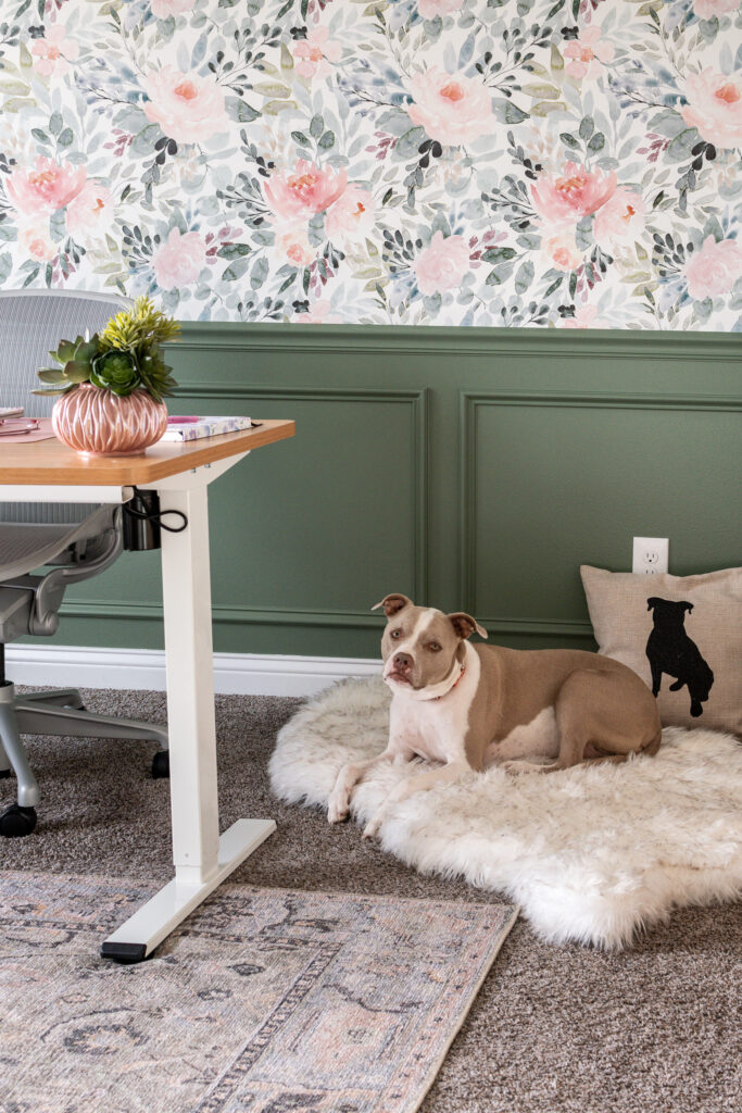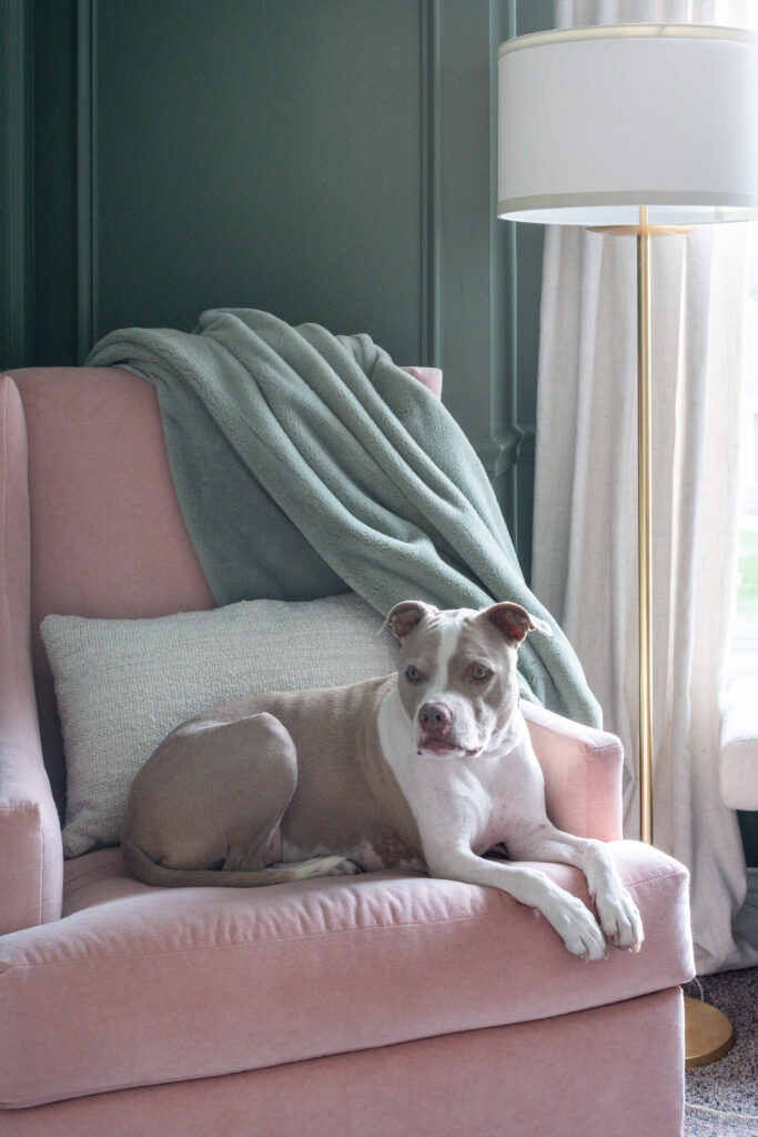 Mary’s pets are a big part of her life (most days, her pretty pup Bellini can be found curled up under her desk at the SDC office!). Like many well-loved furbabies, they like to be wherever she is, so her office needed to include spots for them to stay. Bellini will often curl up on the furry orthopedic pet bed next to the desk, while the cats prefer the soft pink chair. By far their most favorite place, though, is the boucle bench that sits at the height of the window so they can watch the world go by together. These thoughtful additions not only enhance the office’s charm, but add a touch of warmth and companionship to the work environment.