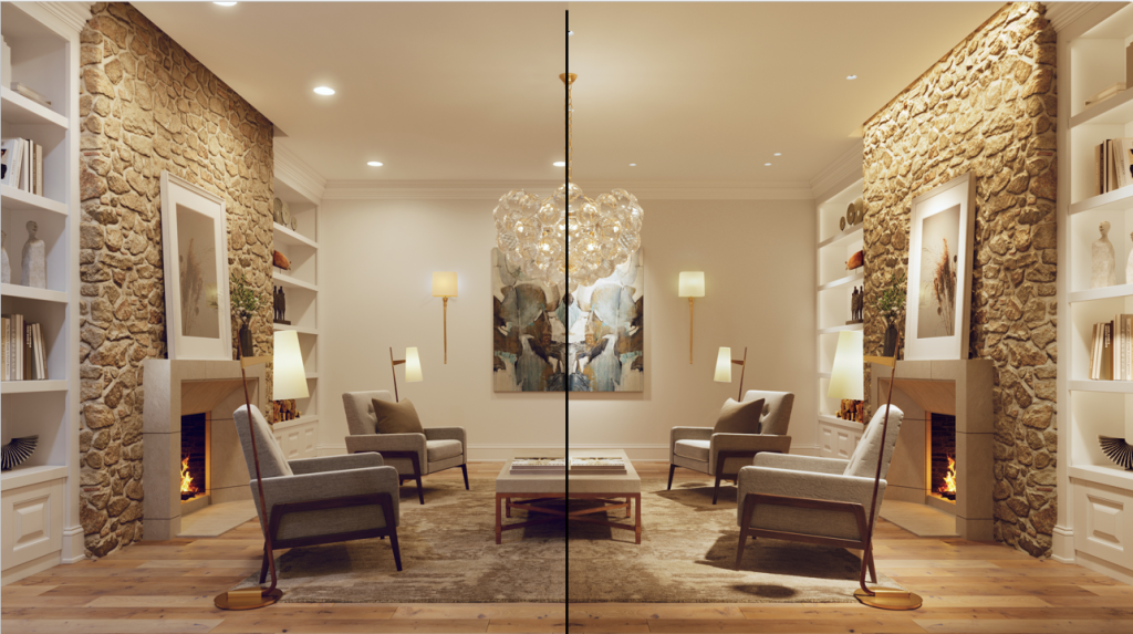 Look at the photo on the left. The stone on the fireplace, the artwork on the back wall, the fabric on the armchairs, and the decor within the bookshelves all appear flat. Why is that? Because the light isn’t being intentionally placed to enhance the overall aesthetic of the room. Instead, it simply floods the space. Now look at the photo on the right. Light is still present throughout the room, but it isn’t distributed evenly. Instead, it’s used with intention, highlighting certain elements and creating depth. Here we are using light to paint the space.